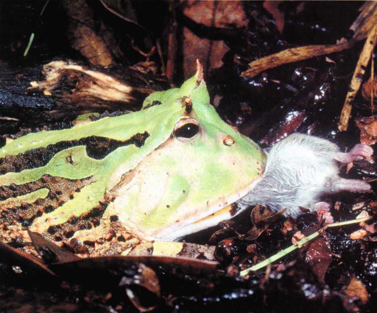 Рогатые жабы — ярко выраженные хищники. Их любимым блюдом являются травяные лягушки, мелкие грызуны и даже небольшие птицы. Всем этим мелким обитателям тропических лесов встречаться с рогаткой не рекомендуется. Стоит им только попытаться проскочить в непосредственной близости от затаившейся рогатки, как хищница настигает их одним мощным прыжком и с помощью липкого языка затягивает в свои челюсти, откуда уже невозможно вырваться. Сопротивление бесполезно: челюсти, как мы уже убедились, достаточно мощные, а «панцирь» отлично защитит рогатую жабу от предсмертных трепыханий жертвы. К этому надо добавить, что практически вся пища, попавшая в жабий желудок, отлично переваривается. Плохо усваиваются только птичьи перья. «Боевые» челюсти рогатки используют только для приёма пищи, а вот в качестве защиты от врагов жабы свою мощную хватку почему-то не применяют. В случае реальной или даже мнимой опасности рогатые жабы поступают следующим образом: они с трудом отрываются от пола, встают на все четыре лапы и начинают раздуваться, издавая при этом угрожающие звуки. «Широко вздохнув, жаба раздулась вдвое больше прежнего и начала выпускать воздух, пронзительно и негодующе крича: одновременно она запрыгала мне навстречу мелкими прыжками, угрожающе раскрывая и закрывая рот. Это было поразительное зрелище…», — писал Даррелл.