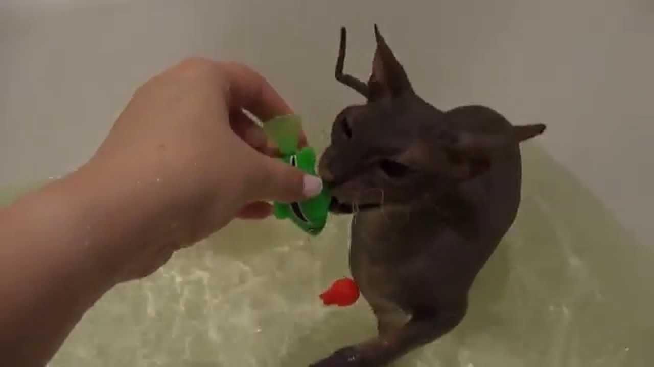 Если сфинкс не против банных процедур и с удовольствием играет в воде, можно предложить ему детские резиновые игрушки. Если же животное испугано, и всеми силами пытается избежать предстоящей процедуры, следует поговорить с ним ласковым спокойным голосом.