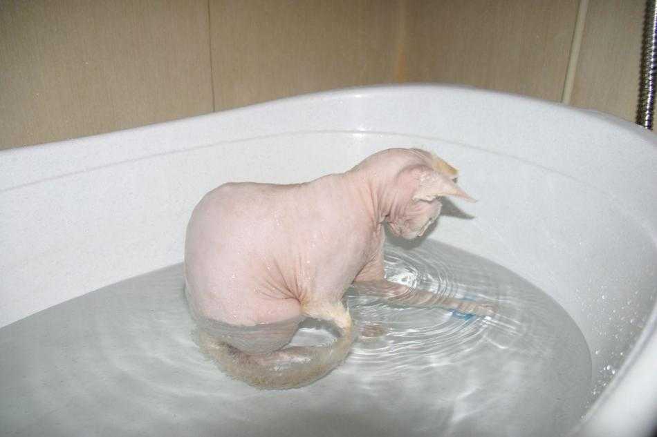 Взрослых котов купают в ванной, котят – в тазике или раковине. Мыльная вода для купания не должна быть прохладной – сфинксы нуждаются в тепле.