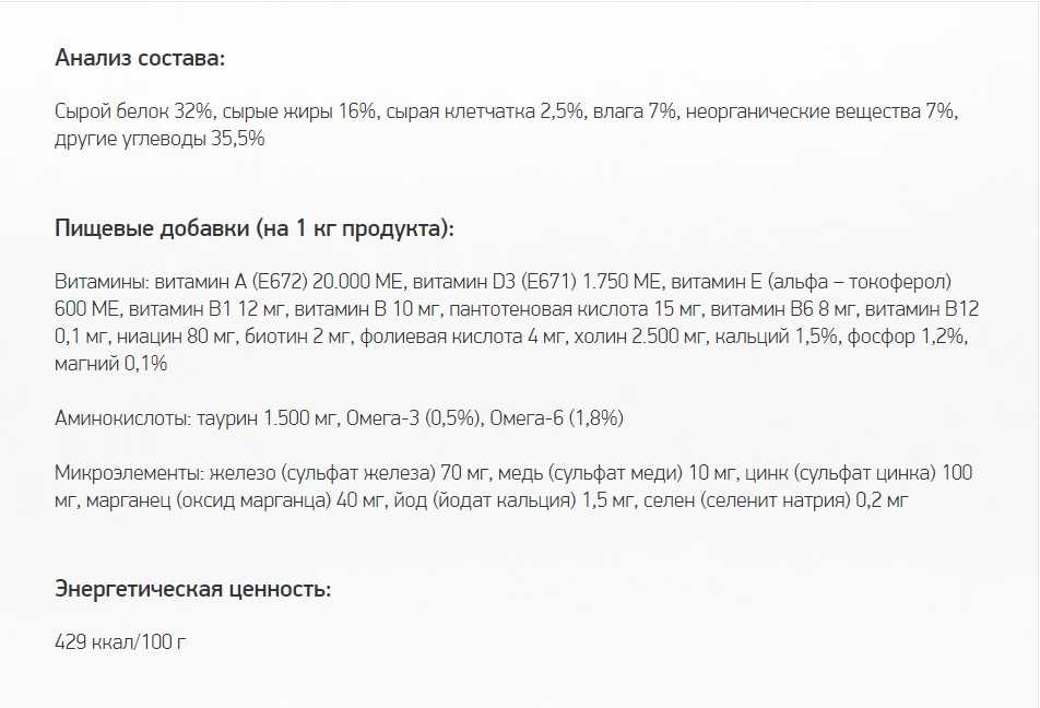 По своему составу корм имеет хорошее содержание различных мясных ингредиентов более 40 – 50%, однако, свежее мясо составляет только 15%, а итоговое содержание мяса в готовом корме – 4-5%. Кроме того, понятие мясные производные означает, что использовалось не только мясо, но и субпродукты.Также имеется оптимальный процент клетчатки от 2,5 до 4,5%, которая играет очень важную роль в здоровой работе кишечника.