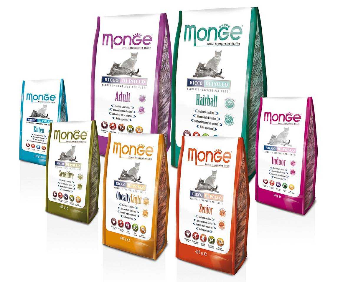 Фирма Монж выпускает большое разнообразие линеек кормов для кошек, как сухих, так и влажных, а также компания производит корма Monge для собак. Информацию о корме можно посмотреть на официальном сайте производителя www.monge.ru.