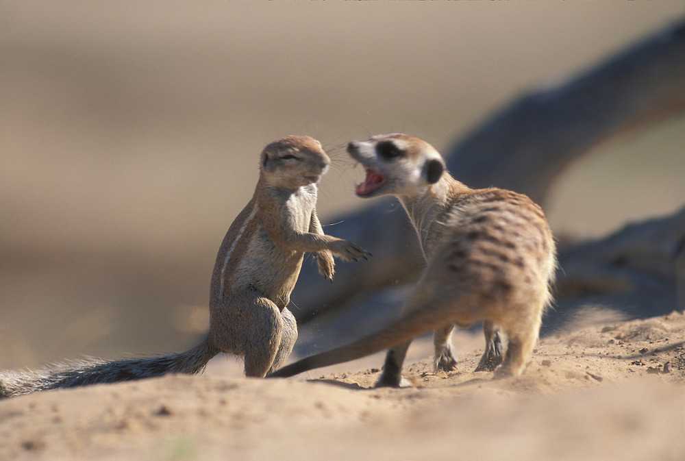 В тех же регионах, где обитают сурикаты, встречается желтый мангуст (Cunictis penicillata), который напоминает очаровательную собачку. Пищевой конкуренции между двумя этими видами нет, поскольку желтый мангуст питается мелкими позвоночными – мышами, птицами, амфибиями. Кроме того, радиус действия мангуста гораздо шире, чем его родственника. Мангуст активен и ночью. Благодаря длинным сильным когтям и ушам, защищенным от попадания песка, сурикаты и желтые мангусты прекрасно приспособлены к рытью нор. И тем не менее они предоставляют эту работу земляной белке (Xerus inauris). Нередко все три вида живут вместе, в одном жилище. От этого выигрывают все: сурикаты отвечают за безопасность жилья, желтые мангусты благодаря быстрому развитию потомства приумножают численность сообщества согласно пословице «Много глаз много видят», а земляные белки предоставляют всем жилье.