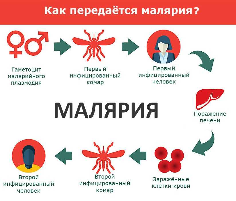 Когда комар кусает зараженного малярией человека, в организм насекомого с кровью переносятся микроскопические паразиты, которые из крови попадают в слюну и передаются здоровому человеку при укусе.