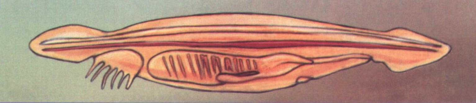Ланцетник – это небольшое, до 8 см длиной, полупрозрачное, сплющенное с боков животное, рыбоподобной формы тела. Задний конец тела более заострен. Вдоль спины тянется небольшая плавниковая складка – спинной плавник, который переходит в хвостовой, и, продолжаясь с нижней стороны тела, образует анальный плавник.