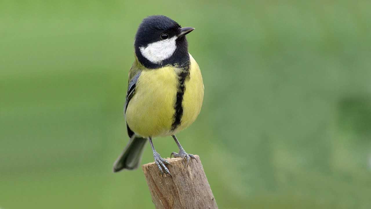 Имеет размеры немного мельче воробья, но свое название оправдывает – действительно, другие представители семейства заметно мельче. Самая известная и самая обычная из синиц, узнаваема по желтому оперению на груди и животе, с черной продольной полосой. У самцов эта полоса ярче и расширяется на брюшке, спина зеленая, голова черная с яркими белыми щеками. Оперение самки, в целом не сильно отличается, но немного бледнее, чем у самца.