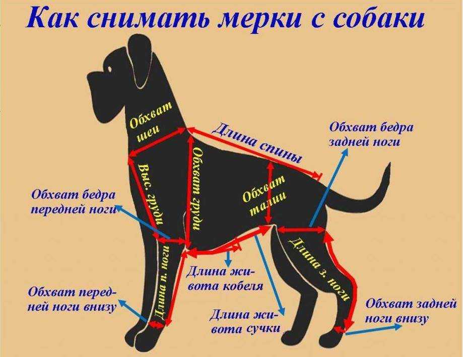 Животное нужно поставить на все четыре лапы на ровную твердую поверхность. Следует начать с измерения длины спины – от холки до хвоста. Снимая мерку с шеи, следует измерять самое широкое место, так же, как и при обхвате груди. Обхват талии, ширину груди также нужно аккуратно измерить. Обязательно у основания проверить длину передних и задних собачьих лап. Определить размеры живота.
