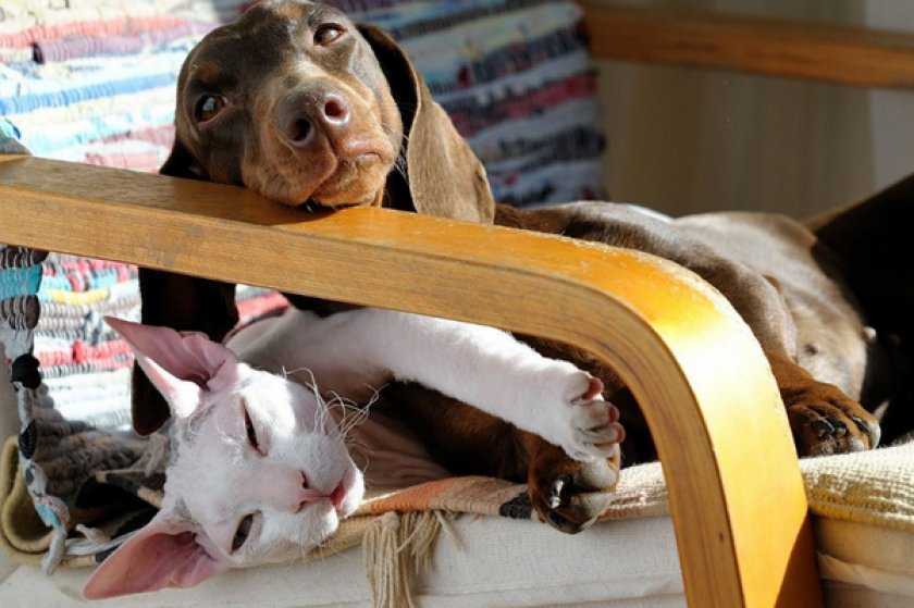 Если изначально у питомцев нет агрессии друг к другу, то, скорее всего через 1-2 недели они подружатся. Хорошее отношение между животными проявляется во взаимном вылизывании, собака и кошка могут спать вместе и есть из одной миски.