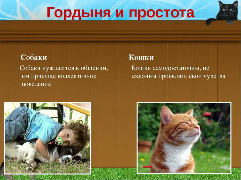 Чтобы получить цельную картину интеллектуальных способностей кошек и собак, следует вынести ряд признаков для каждого вида: чем отличаются кошки от собак в лучшую сторону и наоборот. Кошки отличаются от собак следующими особенностями.