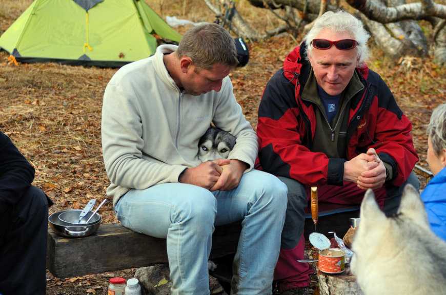 В походе собака обнаруживает, что все происходит как-то более неформально, нежели дома: люди не выгоняют ее «из кухни», а едят тут же, рядом с ней, да еще и с пола! Ну просто хиппи какие-то, как тут не поклянчить. Соседи по лагерю так и вовсе закидывают в собачью пасть все подряд: «Ведь он так смотрит!» На этой почве возможны, во-первых, поносы, во-вторых, отказ от такого обыденного и неинтересного сухого корма. Наш выход: после завтрака или ужина остатки своей пищи (гречка, рис, суп, овсяная каша) мы мешаем с его кормом, так он охотнее его ест и субординация не страдает.