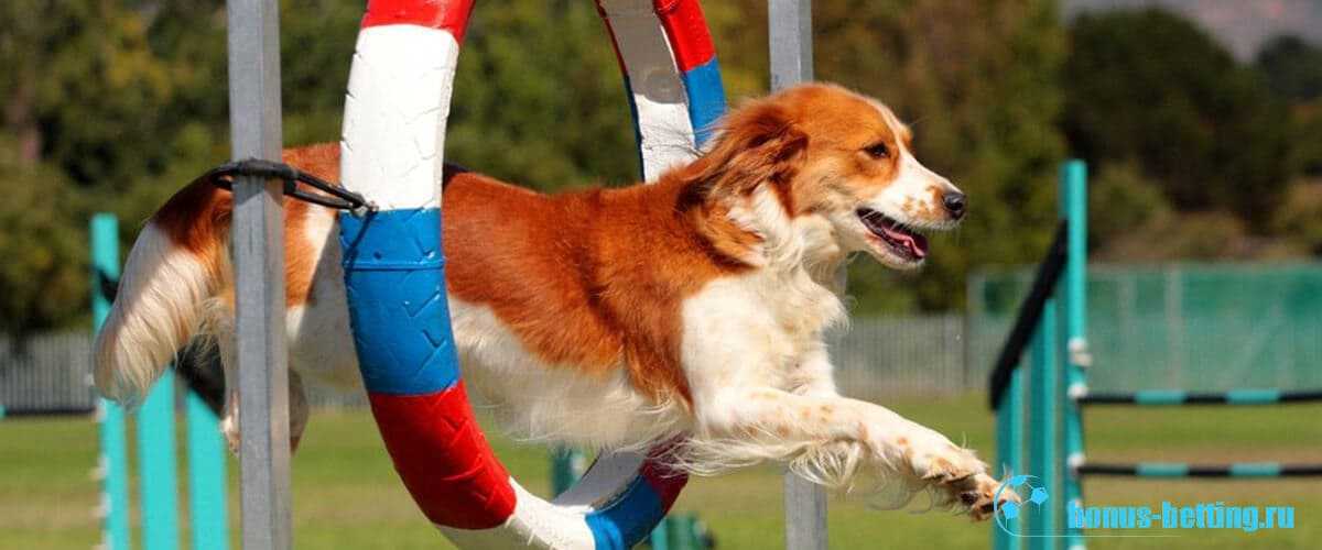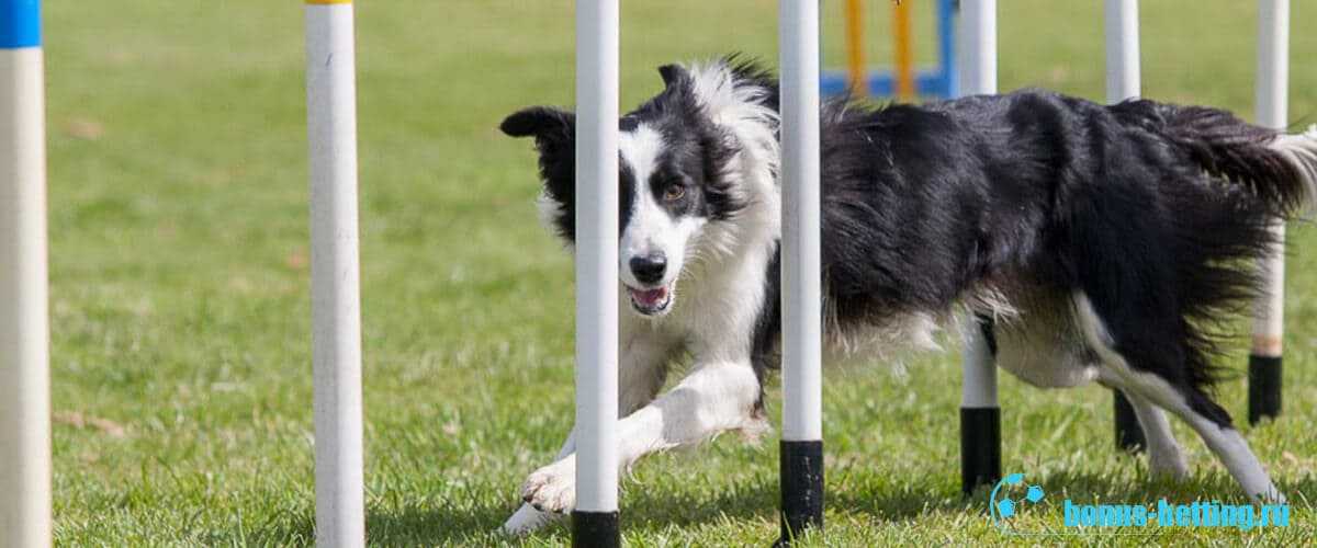 Собака должна выполнять данное действие, чтобы преодолеть две стойки, на которых лежит 2 или 3 перекладины.