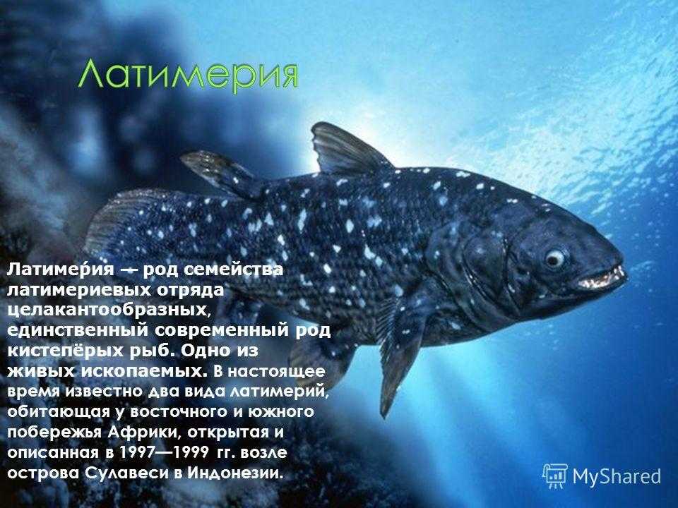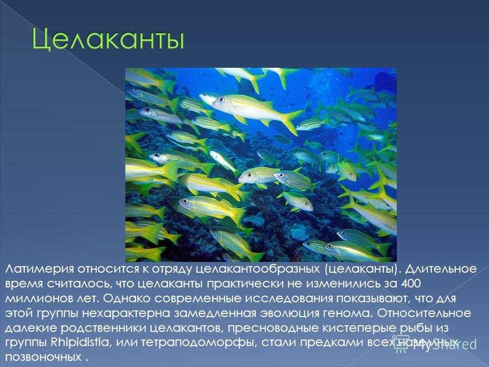Презентация на тему: » Латимерия относится к отряду целакантообразных (целаканты). Длительное время считалось, что целаканты практически не изменились за 400 миллионов лет.» — Транскрипт: