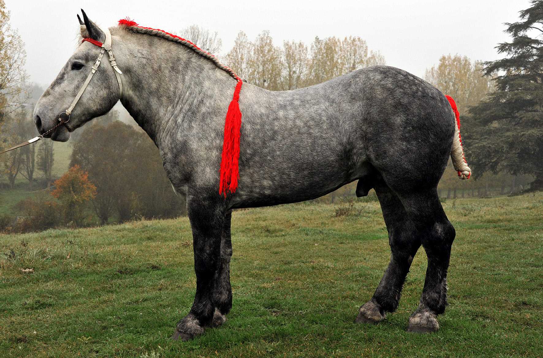 Они очень рослые – дорастают почти до 180 см высоты, и довольно-таки тяжелые (их вес около 800 кг). Окрас шерсти имеют серый, чаще всего в яблоках, иногда вороной.