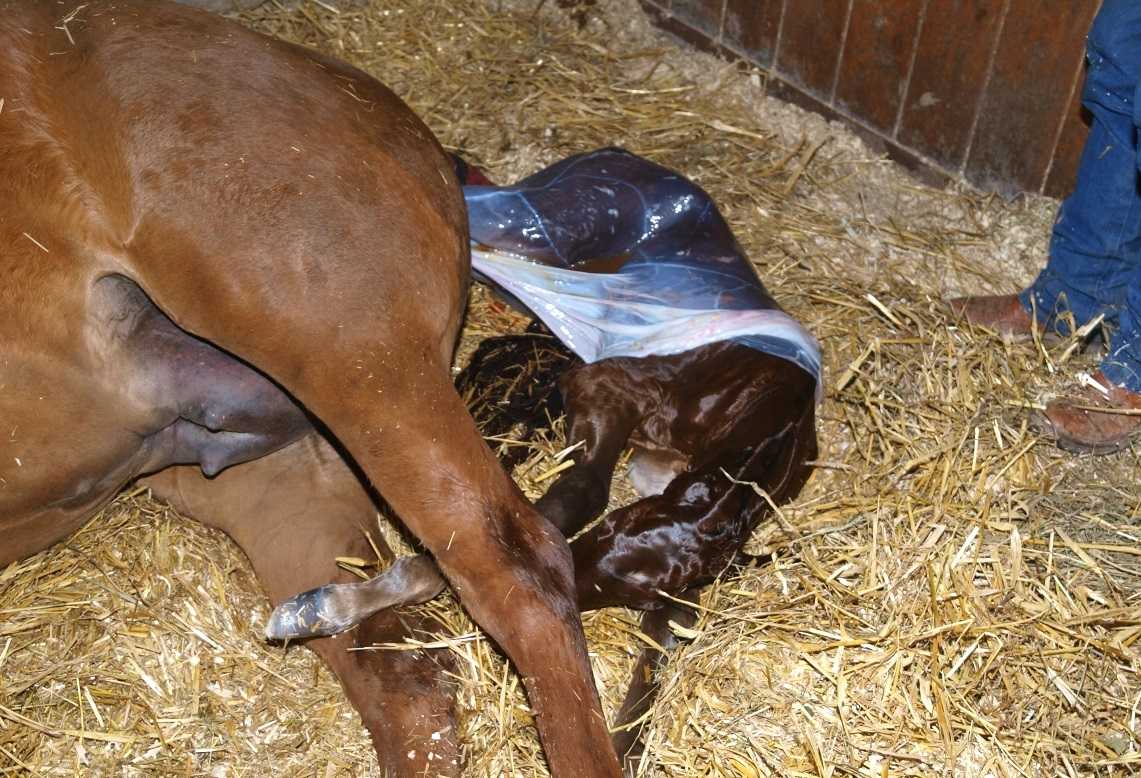 Кобыла ложится на бок, у нее происходят схватки, затем потуги, в результате которых появляется на свет жеребенок. Иногда молодая особь кружится по стойлу, не зная, что делать, и не ложится. В этом случае следует успокоить животное и попытаться его уложить. Для этого потребуется веревка и помощник.