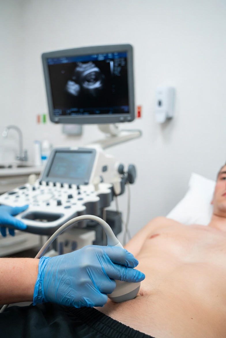 ТРУЗИ. Пациент ложится на кушетку на бок, сгибает ноги и прижимает колени к животу. На ректальный датчик надевается одноразовый презерватив, наносится ультразвуковой гель. Датчик аккуратно вводится в прямую кишку примерно на 5–6 сантиметров — ровно до уровня предстательной железы. Врач вращает датчик для осмотра железы в нескольких плоскостях. При необходимости выполнить биопсию через этот же датчик проводится забор ткани из подозрительных участков — под контролем ультразвука в реальном времени. Процедура занимает в среднем 15–25 минут.